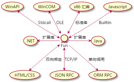在 Windows 平台上, Fun 语言核心库内置支持 Windows API 调用/函数回调 (StdCall 标准), Windows OLE 调用/事件回调; Fun 语言标准库支持 x86 32位汇编语言调用/回调, Javascript 调用/回调; Fun 语言通过扩展库支持 .NET 单向调用, Java 单向调用; Fun 语言内置了一套界面引擎, 可以嵌入 HTML 页面, 支持诸如 CSS/Javascript 等语言, 并且支持 HTML DOM 对象和 Fun 语言变量的双向绑定, 事件驱动的函数调用, 快捷键等; Fun 语言支持通过 TCP/IP (TCP, UDP, HTTP 或者 Websocket) 的 JSON RPC 双向互操作; Fun 语言标准库实现了一套 ORM RPC, 用以支持对关系型数据库的单向操作...