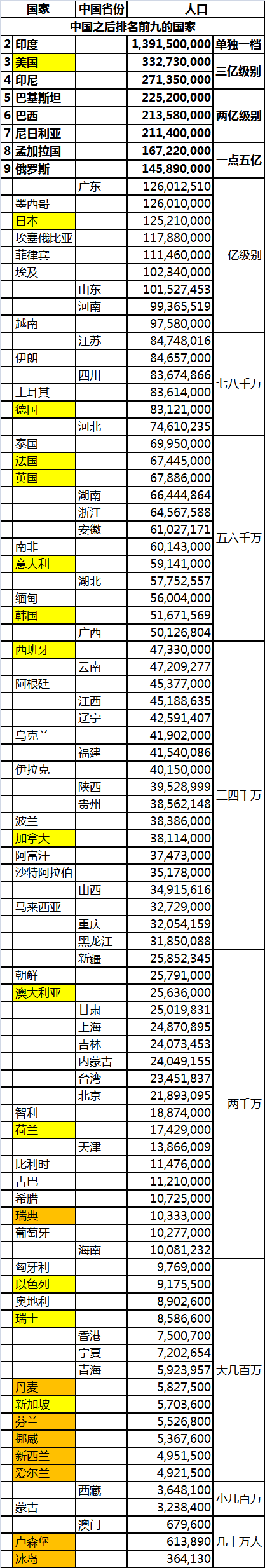 鉴于有些人对世界各国以及中国各省人口缺乏了解, 这里简单的罗列一下数据, 让大家增添一点感性认识.