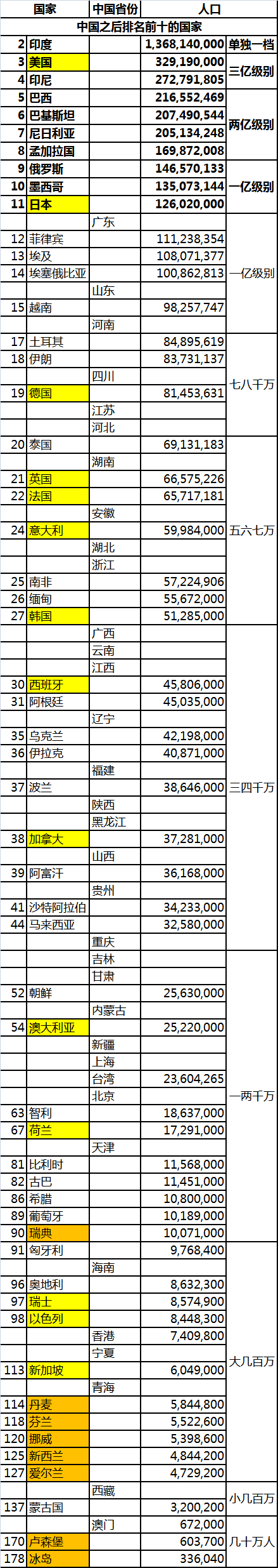 鉴于有些人对世界各国以及中国各省人口缺乏了解, 这里简单的罗列一下数据, 让大家增添一点感性认识.
